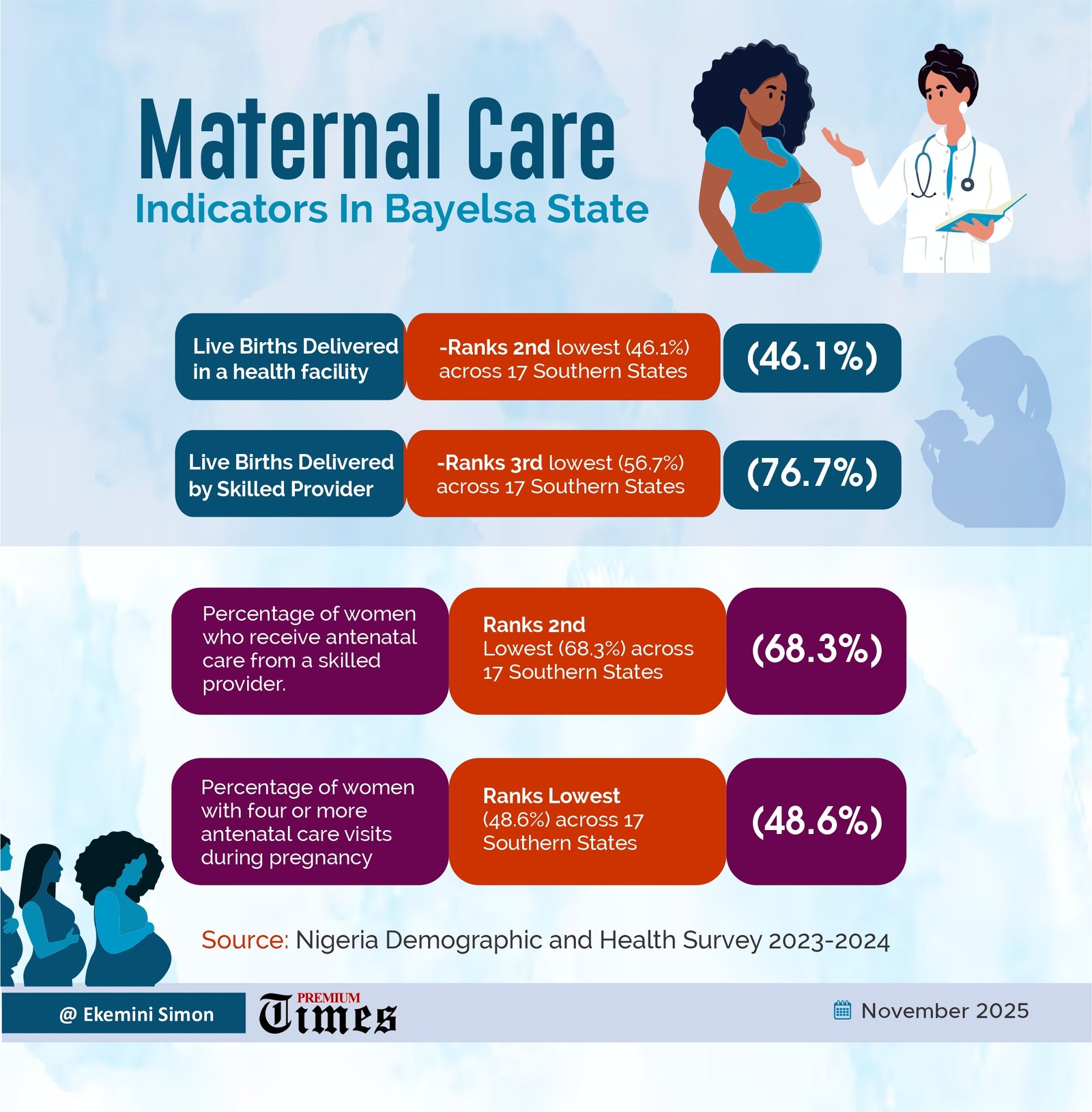 Furthermore, Bayelsa has the second-lowest percentage of live births delivered in a health facility and the third-lowest percentage of births delivered by a skilled provider in the 17 southern states.