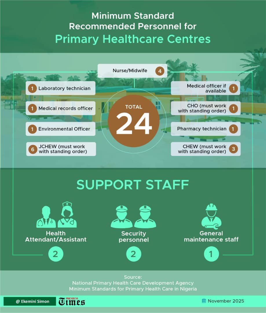 In all the PHCs visited by PREMIUM TIMES, none had employed staff beyond five. This is far below the 24 recommended by the National Primary Health Care Development Agency (NPHCDA) minimum standards for PHCs in Nigeria.