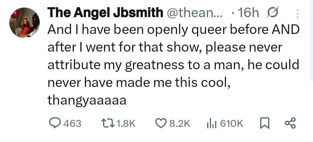 She added: “And I have been openly queer before AND after I went for that show, please never attribute my greatness to a man, he could never have made me this cool, thangyaaaaa.”