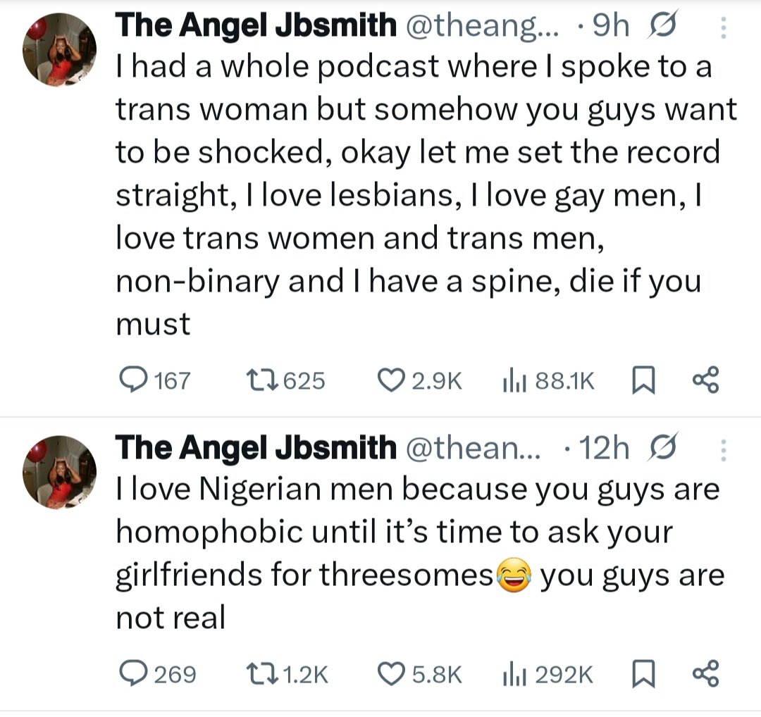 She wrote: “I love Nigerian men because you guys are homophobic until it’s time to ask your girlfriends for thr£esomes. you guys are not real.”
