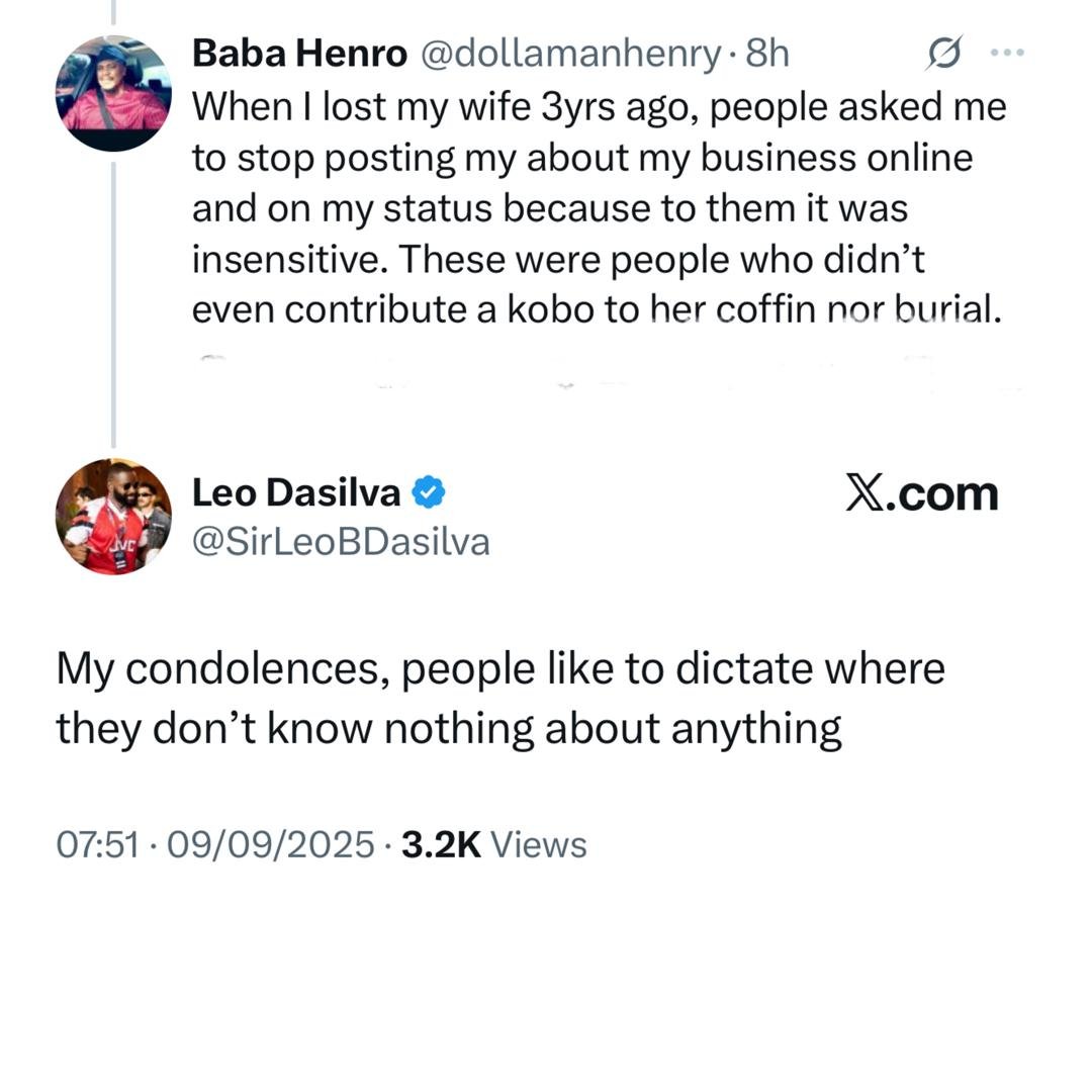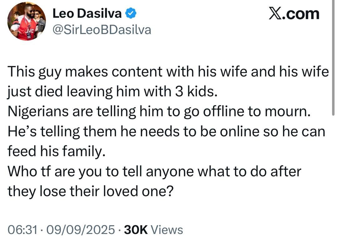 In a post shared on X, Leo stated that a content creator who does his contents with his wife recently lost her and some people are insulting him for posting contents online just after losing her.