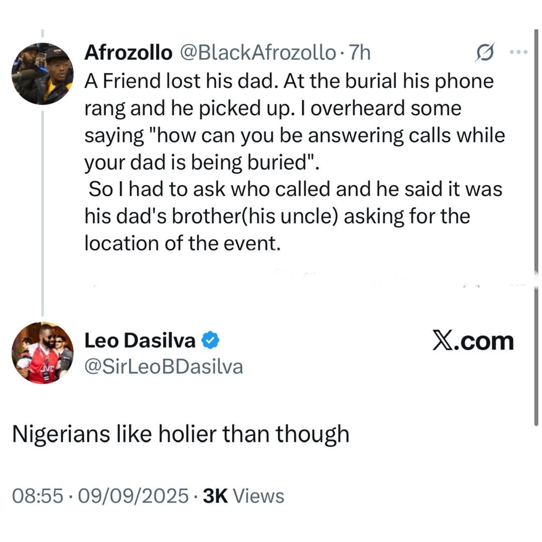 Reality TV star Leo Da Silva has criticized Nigerians who often try to dictate how others should mourn their loved ones.