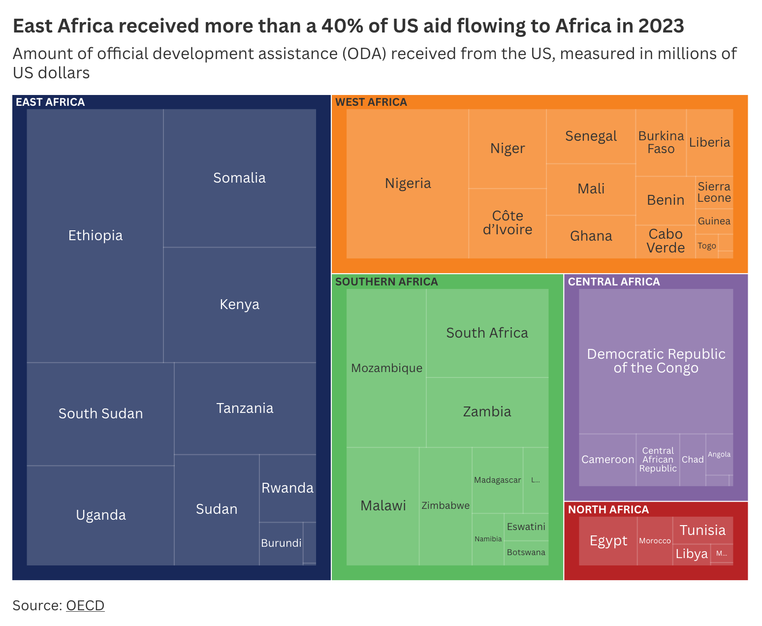 For all its detractors, aid remains important for many poor African countries. In 2023, total overseas development assistance (ODA) from OECD countries to Africa amounted to US$59.7 billion, more than a quarter of which is provided by the US.