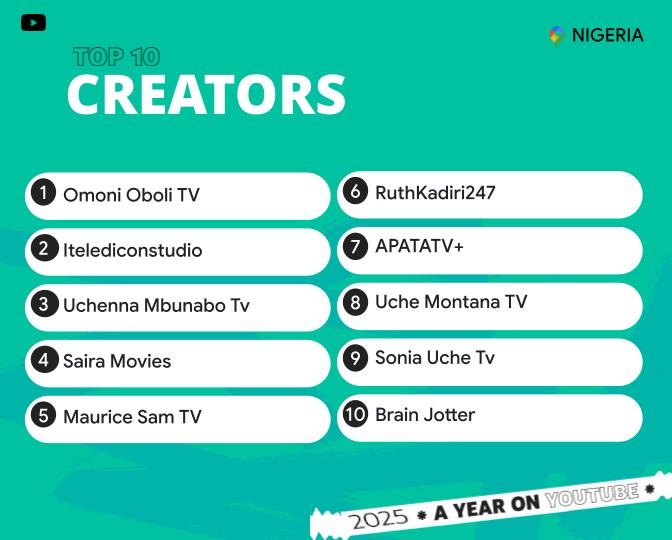 YouTube, the global video-sharing platform where users watch and upload diverse content ranging from vlogs to tutorials, has released its 2025 Nigeria rankings.