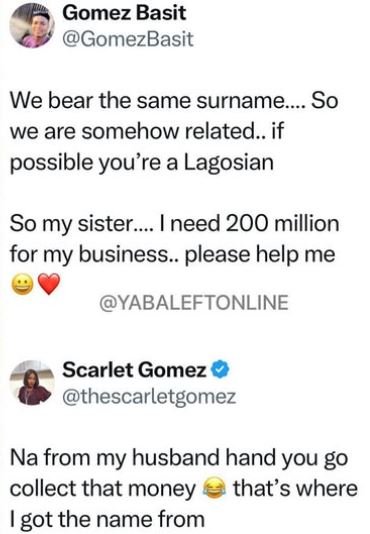 The user wrote: “We bear the same surname…. So we are somehow related.. if possible you’re a Lagosian. So my sister…. I need 200 million for my business.. please help me 😃❤️.”