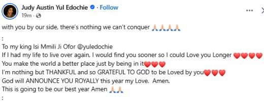 Popular Nigerian actress, Judy Austin has gone on social media to publicly express her undying love for her husband, Yul Edochie.