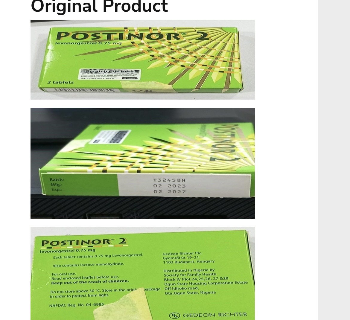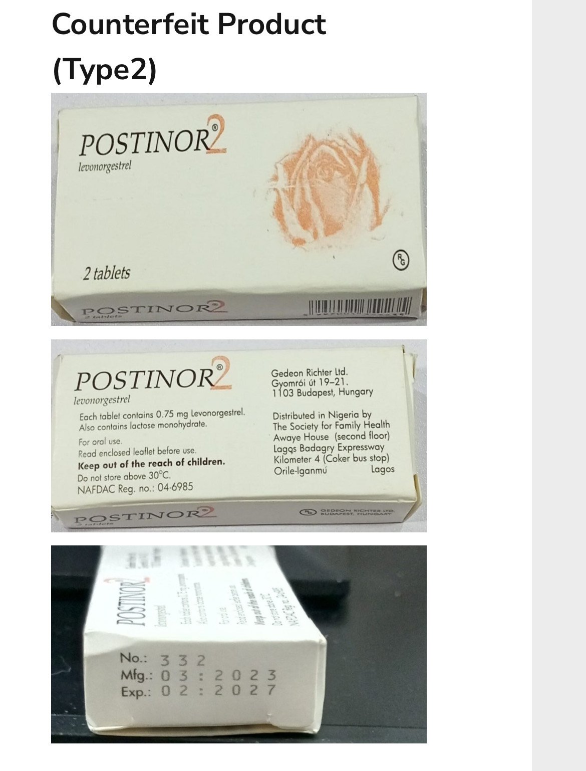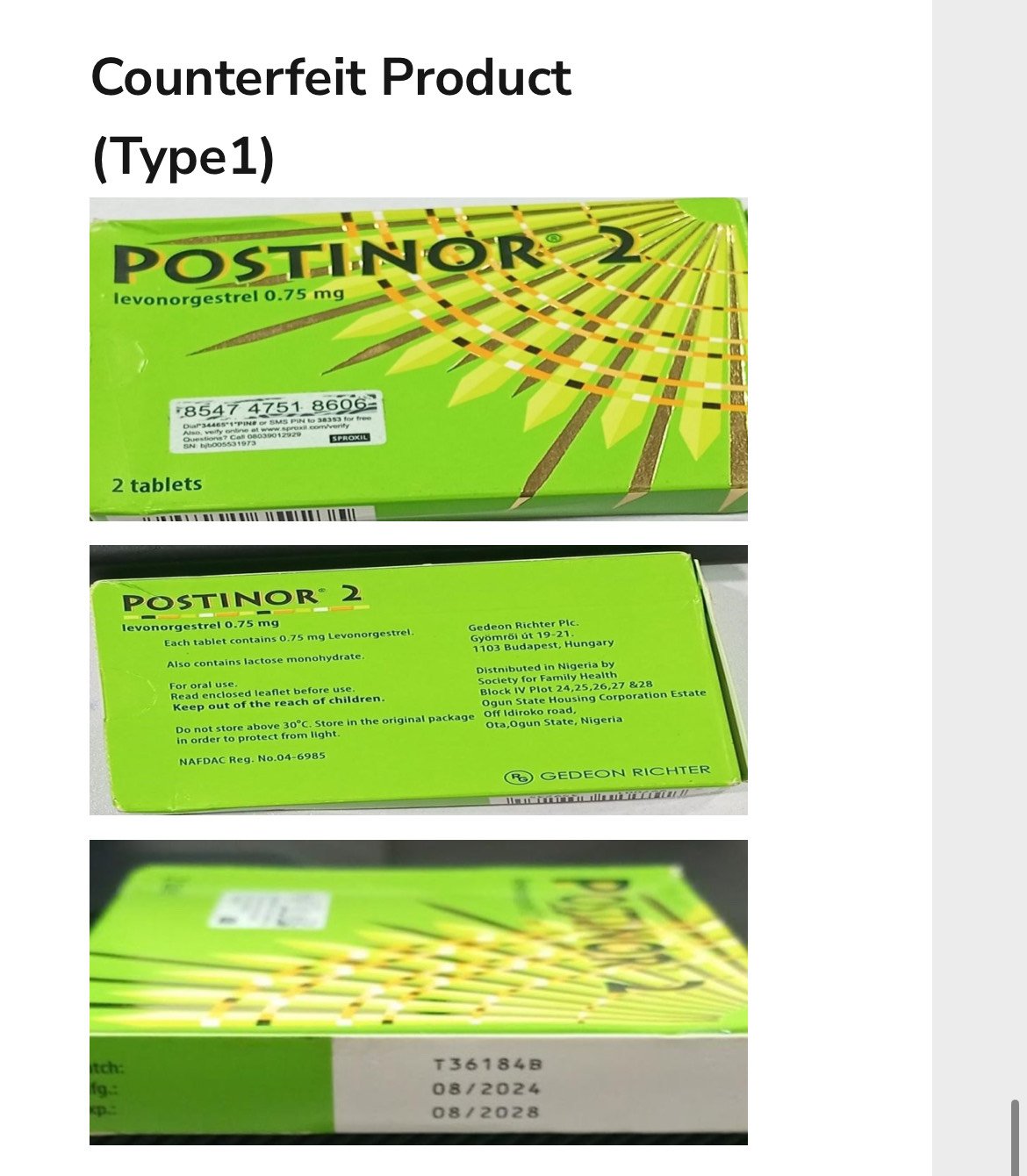 According to NAFDAC, the falsified products were reported by the Society for Family Health (SFH), the authorised marketing authorisation holder for Postinor-2, which confirmed that it did not import the affected batches.