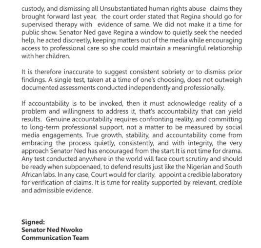 “Long before this matter became public, Senator Ned Nwoko explored every possible avenue to provide support, including private rehabilitation for structured, sustained therapy, not just brief one off, it failed. Denial is never a foundation for sustainable therapy The first step is to own up to the existing problem. When the court gave judgement in favour of Senator Ned having custody, and dismissing all Unsubstantiated human rights abuse claims they brought forward last year, the court order stated that Regina should go for supervised therapy with evidence of same. we did not make it a time for public show. Senator Ned gave Regina a window to quietly seek the needed help, he acted discreetly, keeping matters out of the media while encouraging access to professional care so she could maintain a meaningfut relationship with her children.ย