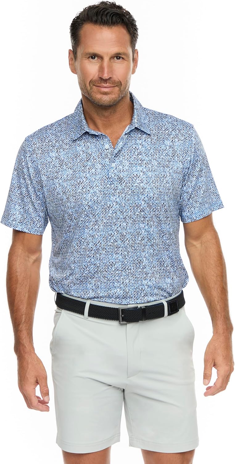 A great option to your solid polo, the Torin brings a little something extra to the course. Notice the small wavy print that adds interest without overwhelming. Moisture wicking and UPF tech keep you protected on and off the course.