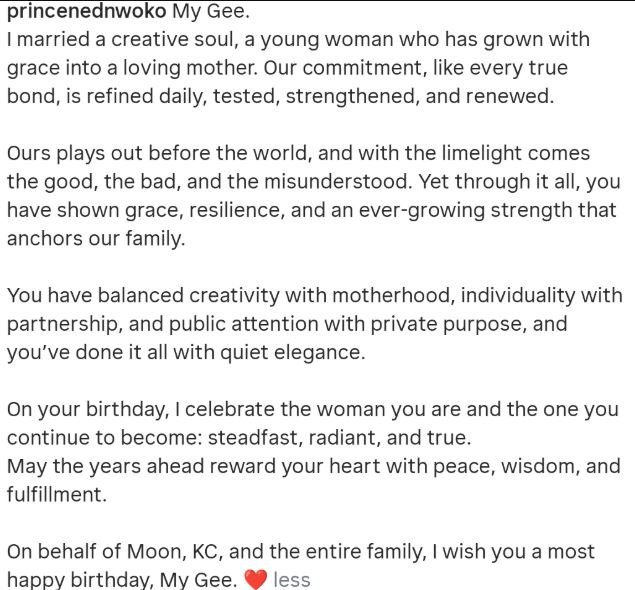 Senator and businessman Prince Ned Nwoko has written a heartfelt birthday message to his wife, celebrating her strength, grace, and remarkable growth over the years.